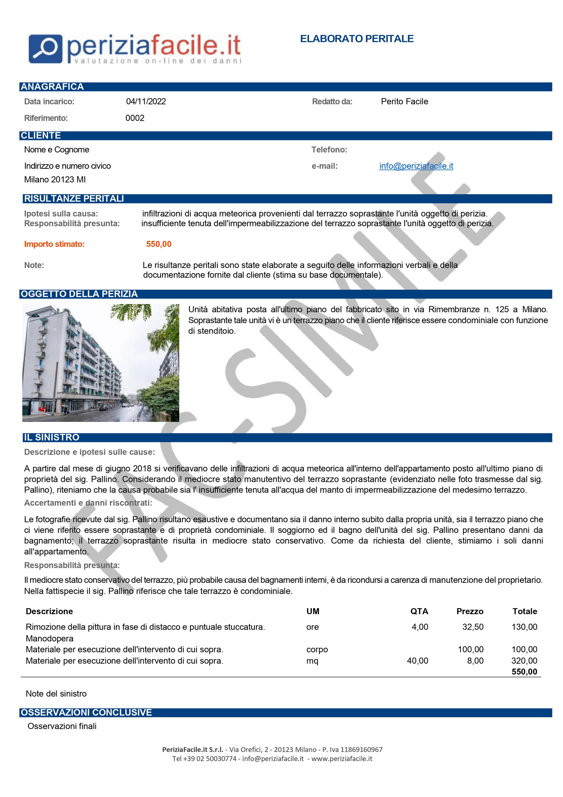 La perizia fornisce una valutazione tecnica ed economica del danno dell'immobile e riporta: